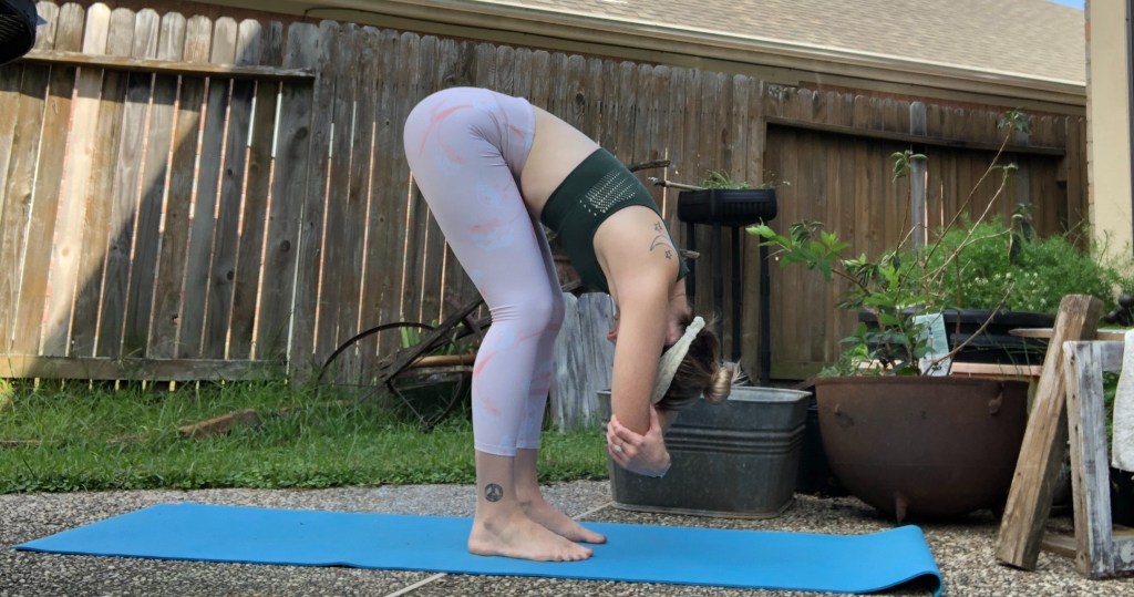 Put a gentle bend in your knees and let your head hang heavy. Reach for opposite elbows and take 5 deep breaths. To come out, tuck your chin to your chest and slowly roll up to mountain.