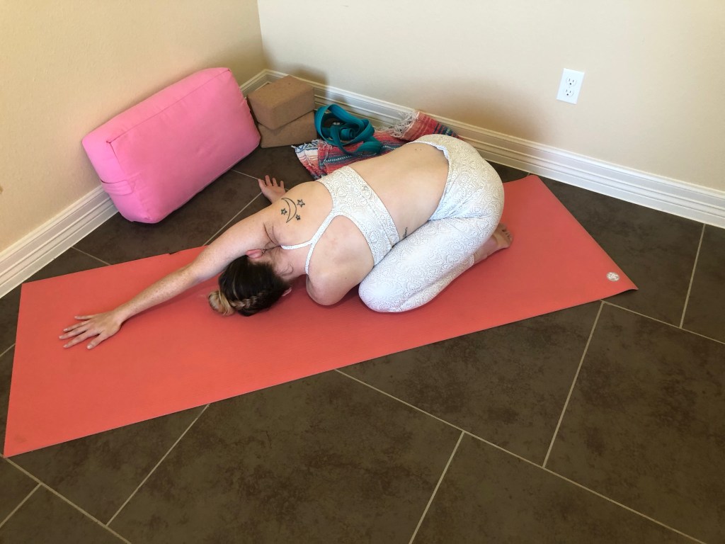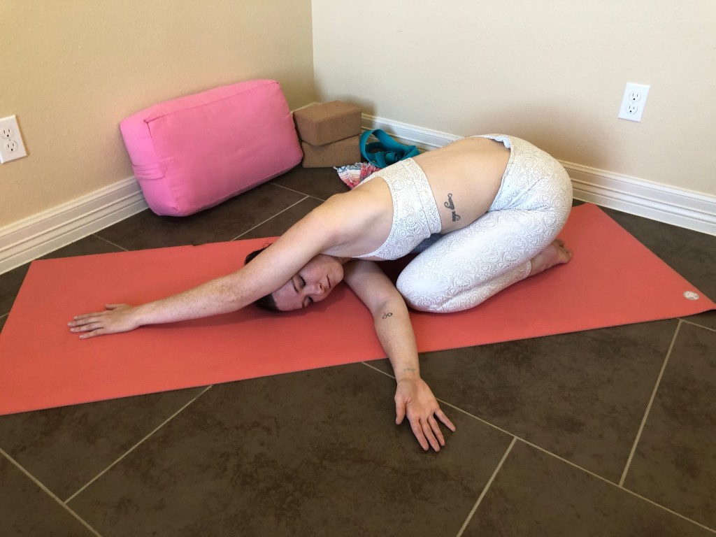 Align your hips over your knees. Extend your hands out and melt into this heart opening pose. Bring your forehead to the mat or a block and stay for 2-3 minutes.