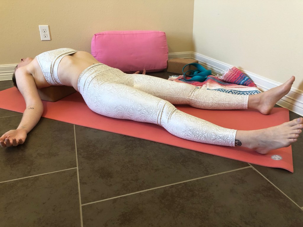 Take up some space on your mat letting your feet and arms fall out to the sides. Relax your jaw and your eyes and stay here for 5-20 minutes. You may even want to cover up with a blanket.